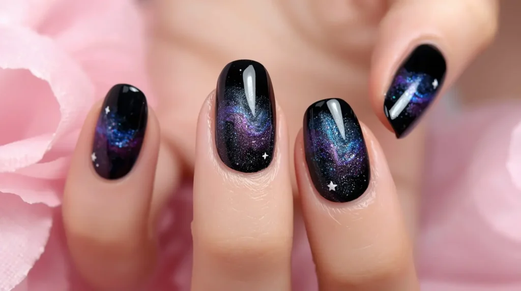 - Galaxy cat eye: Use blue, purple, or green cat eye gel over black, then add a few tiny white “stars” on one accent nail to make it look like space.
